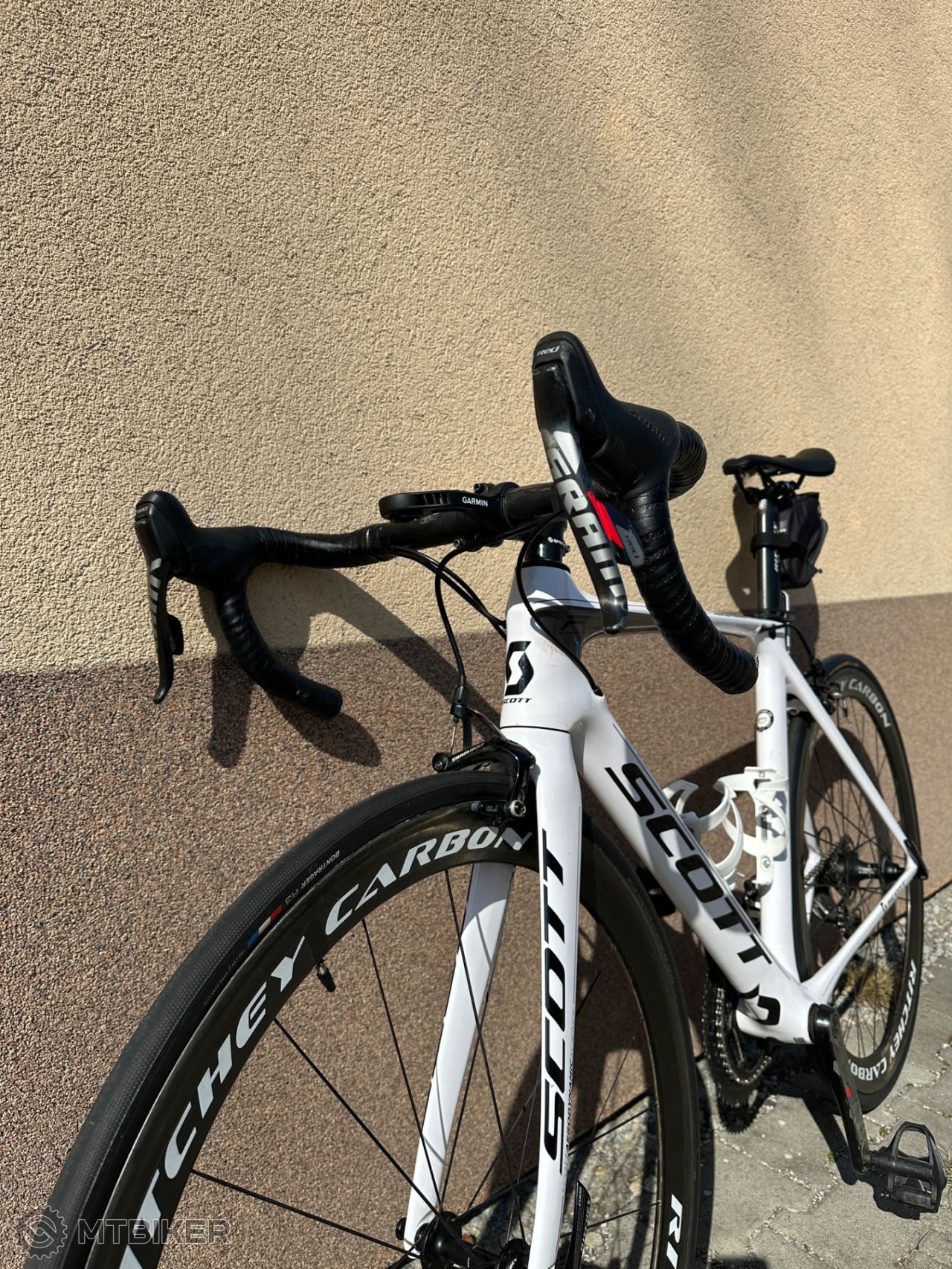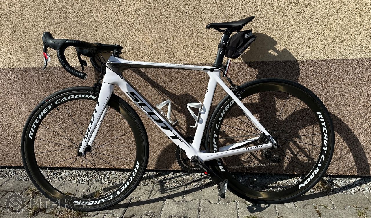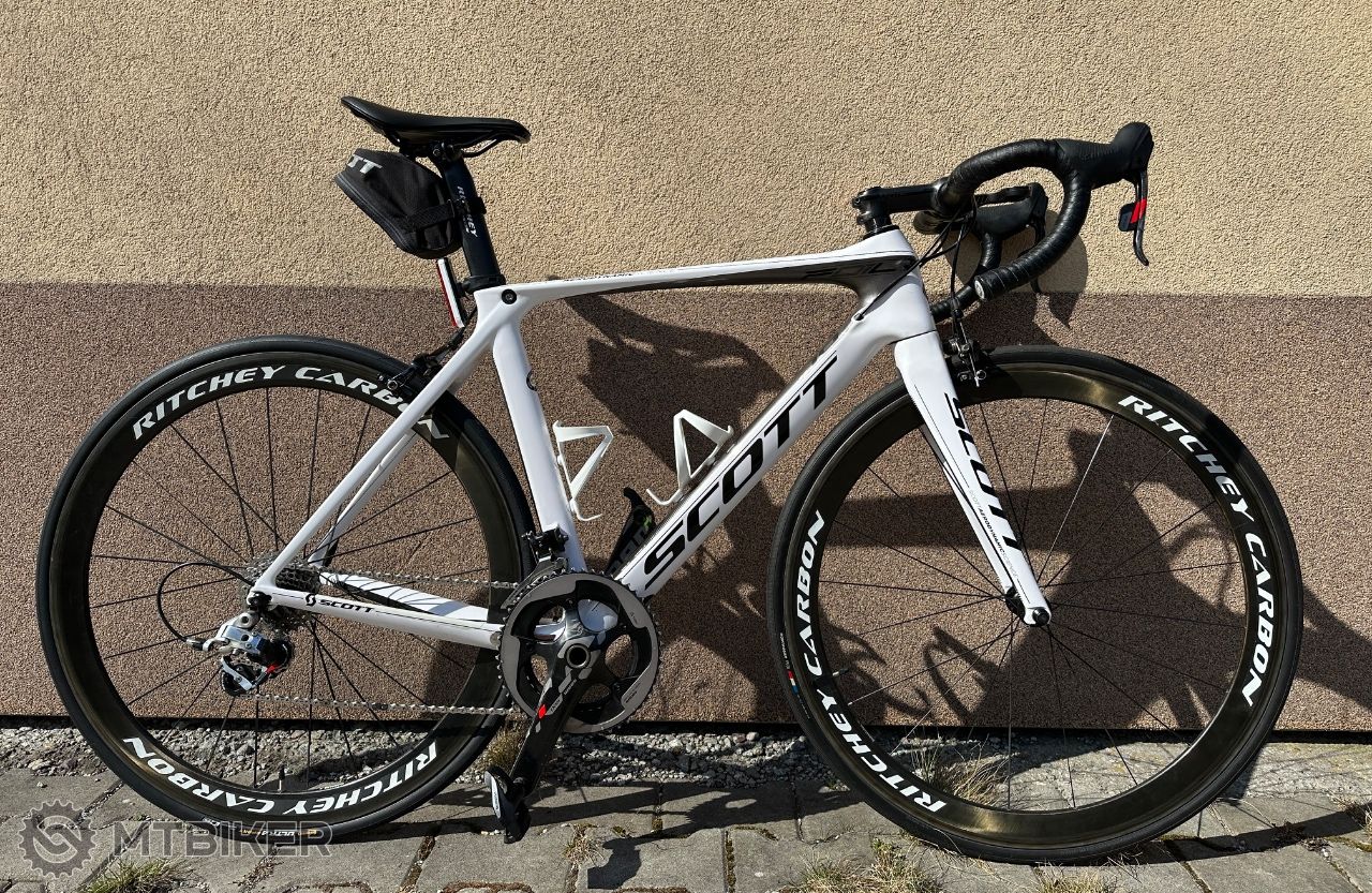 Posuniem na ďalšie lahodné užívanie, pravidelne servisovaný, cestný karbonový bike na ľahučkých kolesách RITCHEY CARBON, postavný na sade RED SRAM 2x10. Celková váha spolu cca 6,8kg, čo oceníš v kopcoch. Veľkosť 54 (M/L) výška 175-180. Aktuálne po malom servise, nová reťaz, brzdy, lanká (predok/zadok), zadný plášť CONTI. Všetko naňom ostáva ako je, pedále Shimano, 2x carbon košíky BONTAGNER, kapsička na spotrebný material pod sedadlom Scott.